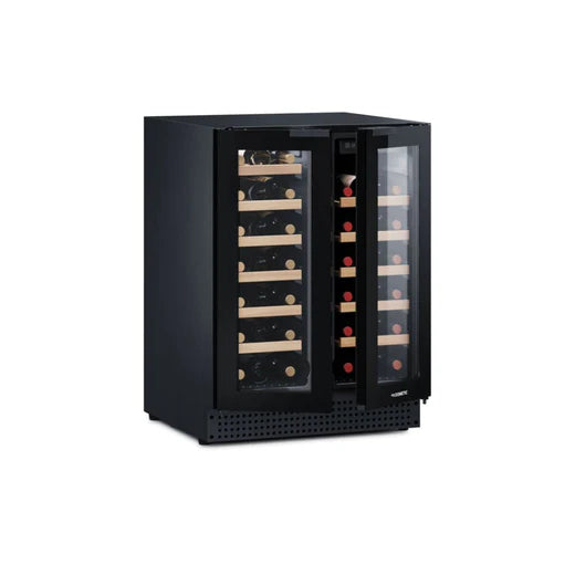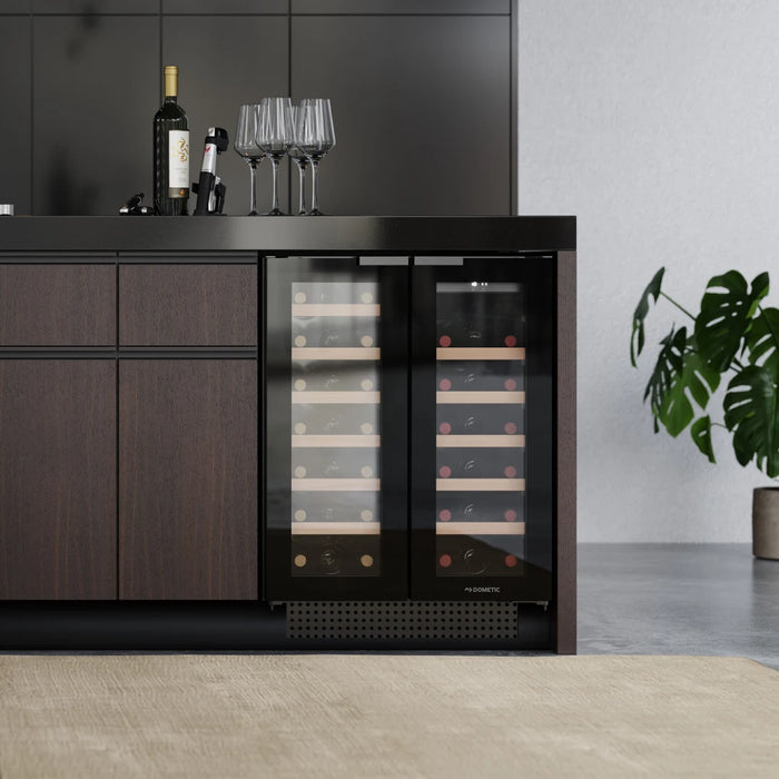 Der Dometic D42B kann als Theken- oder freistehender Weinkühler verwendet werden. Dank der verstellbaren Füße lässt sich die Höhe von 82 bis 89 cm anpassen, sodass er perfekt unter Ihre Arbeitsplatte passt. Das grifflose Design mit integrierten Zuggriffen verleiht dem Kühler ein elegantes, modernes Aussehen, während die Doppeltüren die beiden Temperaturzonen trennen. Der Weinkühler verfügt über ein schwarzes Gehäuse, ausziehbare Holzregale und LED-Beleuchtung für eine elegante Weinpräsentation.