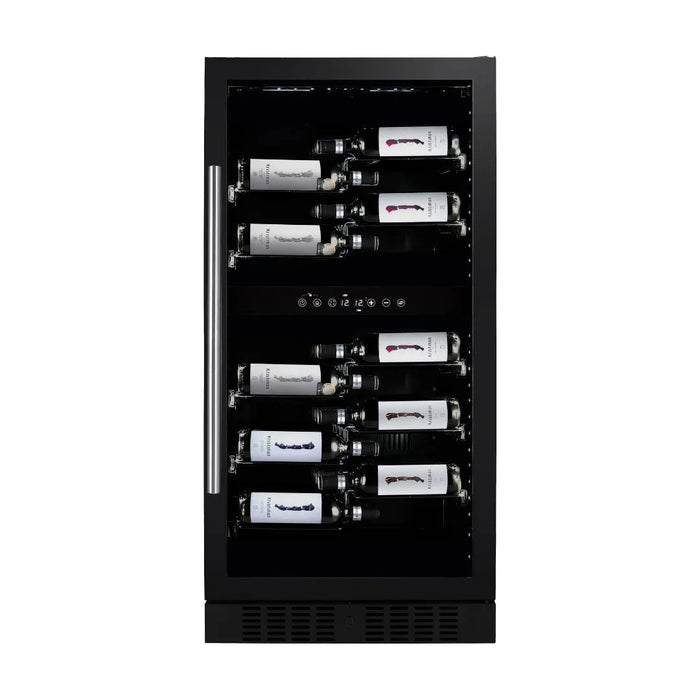 Der Dunavox Grande DX-58.258DB verfügt über zwei unabhängig voneinander regelbare Temperaturzonen. Die obere Zone bietet einen Temperaturbereich von +5 °C bis +12 °C und fasst 24 Flaschen – ideal für Weißwein oder Champagner. Die untere Zone bietet einen Temperaturbereich von +12 °C bis +20 °C und fasst 34 Flaschen, ideal für Rotweine. Insgesamt bietet der Schrank Platz für 58 Flaschen, übersichtlich angeordnet auf den Etikettenablagen. Die Einstellungen erfolgen bequem über das digitale Touchscreen-Display.