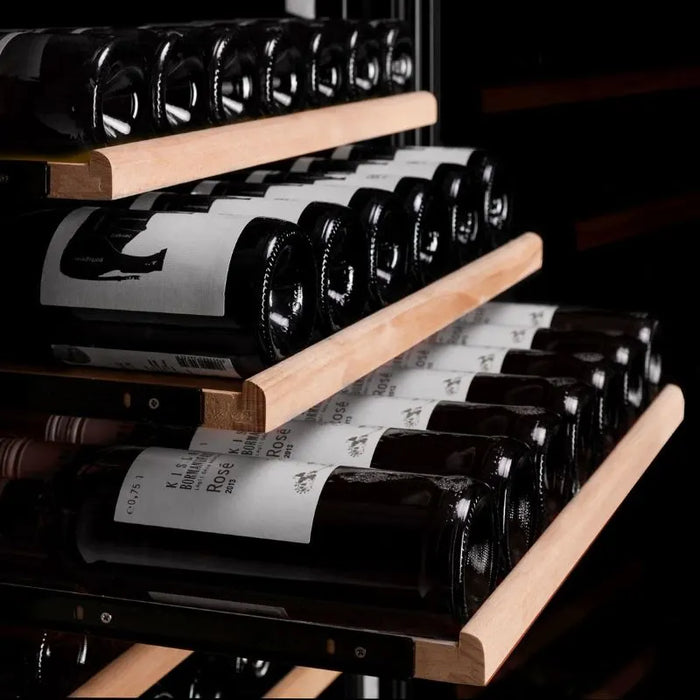 Der Grande-108 fasst 108 Bordeauxflaschen (0,75 l) in zwei separaten Temperaturzonen. Die obere Zone kann zwischen 5 und 12 °C eingestellt werden, die untere zwischen 12 und 20 °C. So können Rot- und Weißweine gleichzeitig bei idealer Temperatur gelagert werden. Dieses Modell verfügt außerdem über eine automatische Abtaufunktion, eine dreischichtige UV-geschützte Glastür mit umkehrbaren Türen sowie ein Belüftungs- und Antivibrationssystem zur Erhaltung der Weinstabilität. Der Energieverbrauch beträgt ca. 155 kWh pro Jahr (Energieeffizienzklasse G) und der Geräuschpegel liegt bei 39 dB. Die Maße betragen 167 cm Höhe, 59,5 cm Breite und 58 cm Tiefe.
