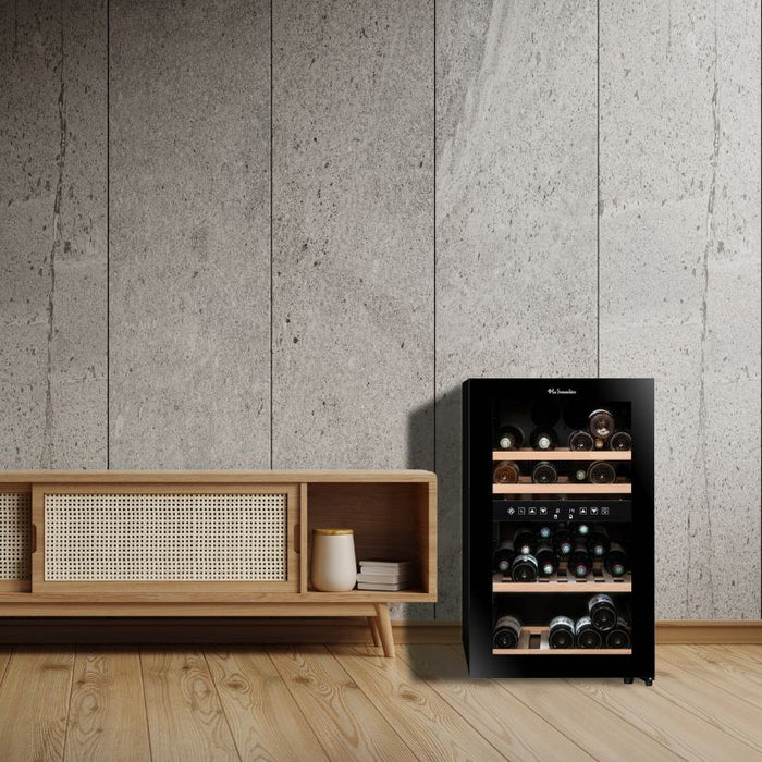 Der La Sommelière SLS45DZ bietet Platz für bis zu 45 Bordeauxflaschen (75 cl), aufgeteilt in zwei Temperaturzonen. Die obere Zone fasst 21 Flaschen Weiß- oder Roséwein bei einer kühlen Temperatur von 5 °C bis 10 °C, während die untere Zone 24 Flaschen Rotwein bei 10 °C bis 20 °C lagert. Diese Anordnung ermöglicht Ihnen die gleichzeitige Lagerung verschiedener Weine bei ihrer idealen Serviertemperatur. Die flexible Einteilung mit Holzregalen erleichtert die Organisation Ihrer Sammlung.
